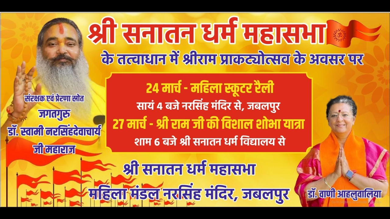रामनवमी के पूर्व श्री सनातन धर्म महासभा महिला मंडल द्वारा कल मंगलवार सायंकाल 4 बजे नारी शक्ति नारायणी शक्ति द्वारा एक विशाल स्कूटर वाहन रैली निकाली जाएगी जिसे श्रीमद् जगतगुरु डॉ स्वामी नृसिंहदेवाचार्य जी महाराज व संतगण केसरिया वाहन दिखा कर रवाना करेंगे।